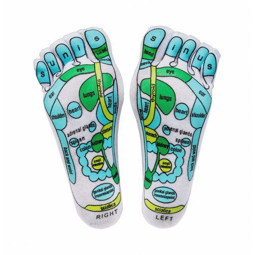 Masážní ponožky k individuální i partnerské masáži. Užijte si uvolňující masáž reflexních bodů na chodidlech – zcela jednoduše a v pohodlí domova. Namasírujte se sami, nebo se nechte namasírovat od partnera. Když budete při masáží vyvíjet tlak na přesně určené body, příjemné pocity na sebe nenechají dlouho čekat. Tlak by neměl být tak veliký, aby byl nepříjemný. K lepšímu účinku masáže reflexních bodů na chodidlech přispívají také uvolněná poloha těla, čerstvý vzduch a příjemná atmosféra. Potištěná spodní strana ponožek pomůže přesně určit oblast působení podle tradiční čínské medicíny. Podle učení tradiční čínské medicíny (TČM) se různé části těla zrcadlí na chodidlech. Masáž konkrétních bodů tak může mít blahodárný vliv na jednotlivé tělesné oblasti. Masážní ponožky jsou velmi pohodlné a umožňují přesnou lokalizaci jednotlivých reflexních bodů. Stimulace těchto bodů uvolňuje napětí a vysílá do těla vlny příjemné energie. Prstové ponožky jsou z 90 % z bavlny, která je příjemná na dotek, a z 10 % z polyamidu, který drží tvar. Mohou se prát v pračce na 30° C (nesušte v sušičce). Díky gumičce ponožky dobře sedí, a přitom se nezařezávají. Návod s mapou reflexních bodů je součástí balení.