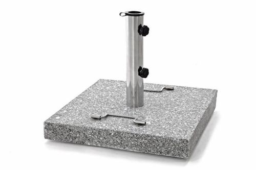Stojan pro slunečníky - žula a ocel - 45 x 45 cm Masivní a velmi těžký stojan na slunečník z leštěné žuly v kombinaci s ušlechtilou ocelí. Stojan je vybaven dvěmi zabudovanými kolečky na spodní straně a a dvěma madly z nerezové oceli na horní hraně pro snažší transport. Stojan je vhodný pro slunečníky do průměru 3 metrů. Za pomocí dvou postranních šroubů můžete upevnit na trubce z nerezové oceli tyč slunečníku s maximálním průměrem 45 mm. Součástí dodávky je redukční kroužek na průměr 3,5 cm. Nevhodné pro závěsné slunečníky. Technické údaje: mateirál: žula, trubka z nerezové oceli madla z nerezové oceli hmotnost: cca 30 kg rozměry: 45 x 45 x 5,5 cm Obsah balení: 1 x stojan na slunečník 1 x trubka z nerezové oceli s montážním materiálem