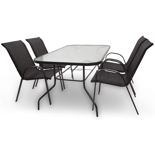 Sestava hliníkového nábytku složená ze 4 křesel a stolu. Stůl o rozměru 150 x 96 x 71 cm s deskou z čirého tvrzeného skla. Rozměr křesel 55 x 71 x 93 cm, výplň z umělé textílie. Možnost umístění slunečníku. Zcela bezúdržbový. Vhodné pro venkovní i vnitřní použití.