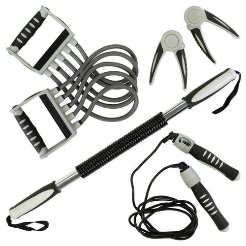 Expandér/elastický pás je určen pro všestranný trénink všech svalových skupin vašeho těla. Zejména horní část těla se s ním dá tvarovat. V závislosti na úrovni trénovanosti si můžete individuálně nastavit napětí. Trenažér pružinových úchopů rukou trénuje svaly předloktí a rukou. Zlepšují sílu úchopu rukou a prstů, vytrvalost, pružnost, svalový tonus a jemnou i hrubou motoriku. Švihadlo je vybaveno kuličkovým ložiskem, které usnadňuje jeho otáčení a houpání. Integrováno je také počítadlo, ergonomické rukojeti lana poskytují pohodlný pocit a neklouzavý úchop. Vysoce kvalitní královská pružinová/ohýbací činka nabízí působení síly pomocí pružiny z uhlíkové oceli, která se individuálně přizpůsobuje námaze, a tím maximálně lechtá - ideální pro budování svalové hmoty. Zde se procvičuje celá horní část těla, tj. paže, krk a ramena, hrudník, tricepsy, bicepsy a prsní svaly. Technické údaje: materiál: plast, ocel, pružný barva: černá/šedá pružinové rukojeti / ruční trenažér: cca 14x9 cm rozměr rozšiřovače: cca 74 x 14 cm rozměr rukojeti: cca 10 x 14 cm ohýbací činka: cca 64 cm Obsah balení: 1 x sada expanderů