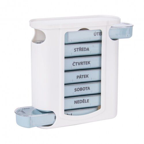 Pokud je vaším každodenním úskalím nezapomenout vzít si své léky, pořiďte si na ně tuto jednoduchou bílou krabičku. Najdete v ní celkem sedm modrých přihrádek, z nichž je každá rozdělená do čtyř samostatných sekcí – ráno, poledne, večer a další.Můžete si do nich připravit předepsanou dávku léků na celý týden. Jednotlivá patra mají označení podle dní v týdnu a vlastní zavírací víčko. Potřebnou přihrádku si tak můžete vzít kamkoliv s sebou a nebát se toho, že léky vytratíte. Aktuální den je vždy nahoře. Když dané patro vyprázdníte, vsuňte jej dospodu boxu, ať máte připraveno na zítra.Celá krabička je vyrobena z kvalitního plastu. Vrchol přihrádek je transparentní, díky čemuž máte přehled o jejich obsahu.